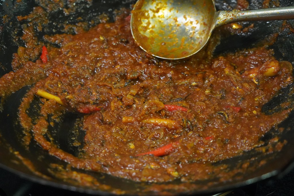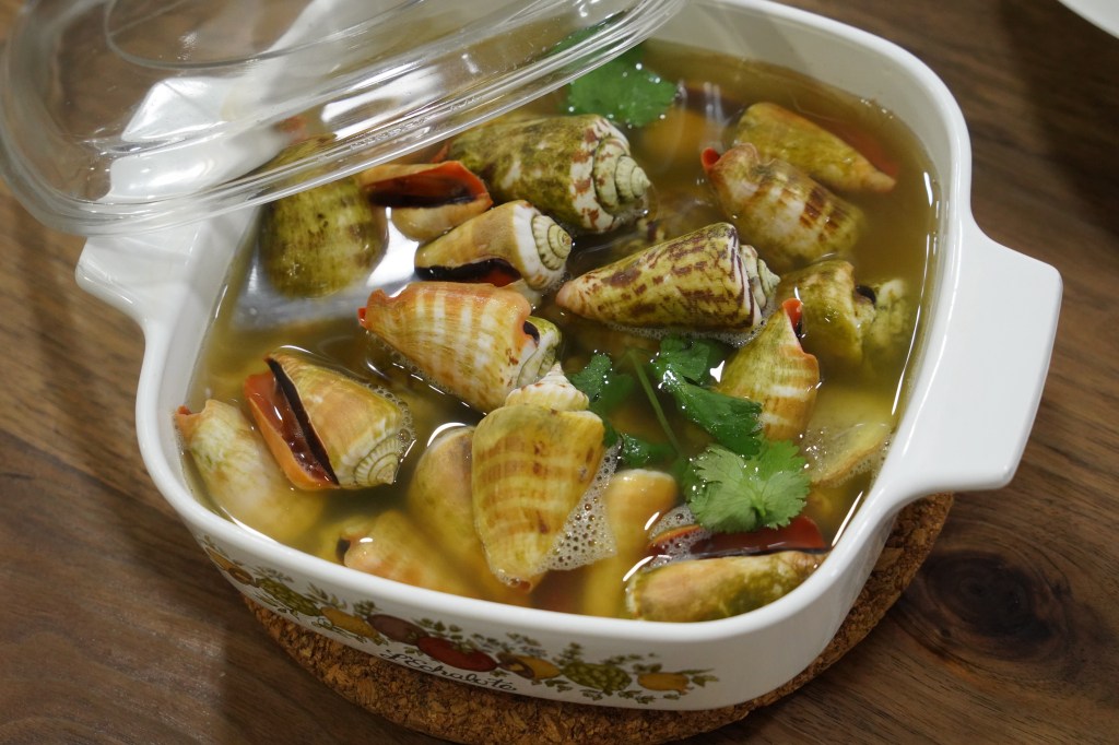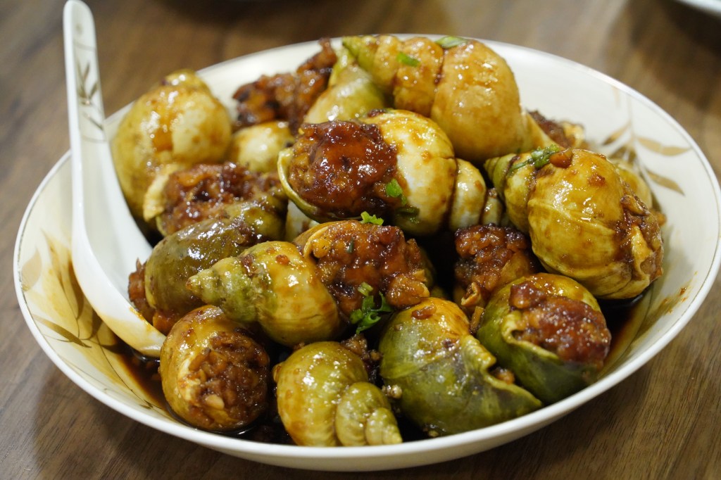 沒魚蒸了,菜仍願做。一味田螺塞肉,改良一下,棄無味的罐頭田螺,用熟翡翠螺。好處是不用再特買螺殼,把肉撩出螺殼直接用回。螺肉切丁,混入花菇粒馬蹄粒和醃好的豬肉,灑芫茜蒜米少許辣椒,魚露糖生抽胡椒粉調味,生粉拌勻。再把材料釀回螺裡,沾上生粉用薑蔥熱油先煎封餡面。然後另鑊煮開冰糖,下生抽老抽麻油花椒油,回入螺細燜至汁醬濃稠,灑一勺太雕酒蓋上即起。正是濃油赤醬,味道合意。